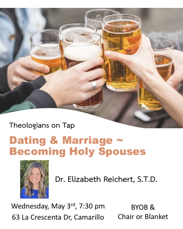 Conversation filled the air as I stepped into the bustling home. Scanning the room, I saw both old and new faces spanning from LA to Santa Barbara. It was Ventura County’s first Theologians on Tap, and the room was buzzing with anticipation. The talk was sure to fall on eager ears, for it was a topic close to everyone’s heart – “Dating and Marriage – Becoming Holy Spouses”. The speaker was Dr. Libby Reichert, a doctor of Moral Theology teaching at St. John’s Seminary. As Dr. Reichert began to speak, heads nodded and smiles grew. She described what she dubbed five common mistakes in dating. Notions such as the relational nature of the Trinity, God’s total otherness, the damage of the Fall, and the Aquinas’ definition of love brought theological roots to her practical principles. Dr. Reichert addressed each point in her casual, rhythmic and approachable manner. The talk was completed with enthusiastic clapping and a few faces (my own included) still fighting to absorb and retain it all.