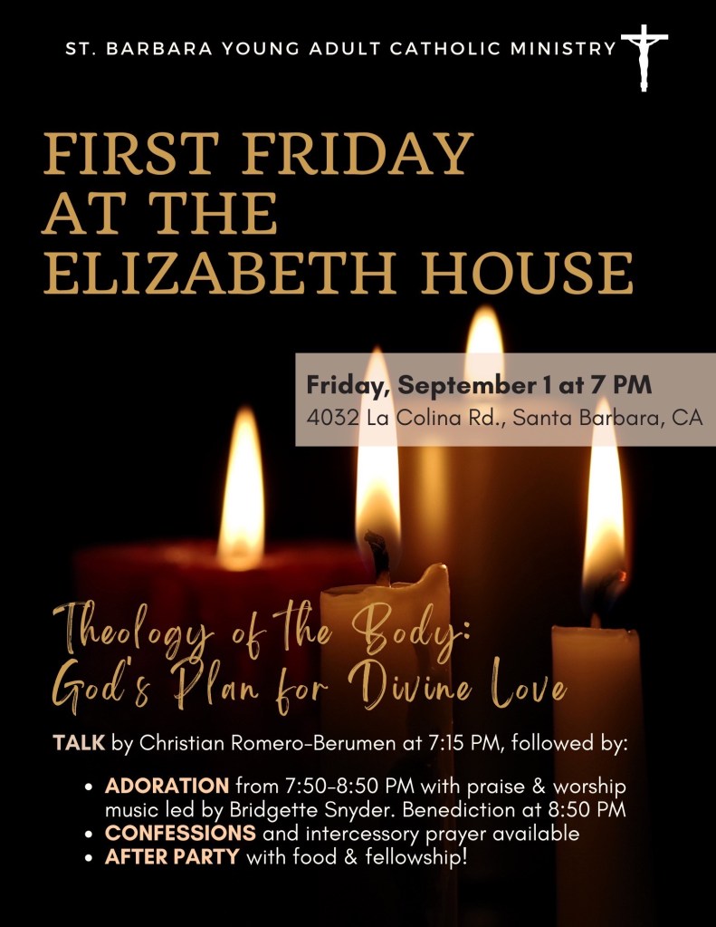 Join St. Barbara YAM for First Friday with guest speaker, praise & worship, confession, and fellowship! Featuring Christian Romeo-Berumen speaking on “Theology of the Body: God’s Plan for Divine Love”.