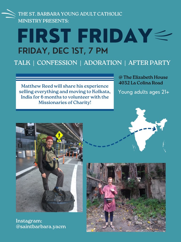 Join St. Barbara YAM on December 1st for their First Friday event at the Elizabeth House! Grab a friend, hear the amazing story of a world traveler, spend time in adoration and meet someone new!