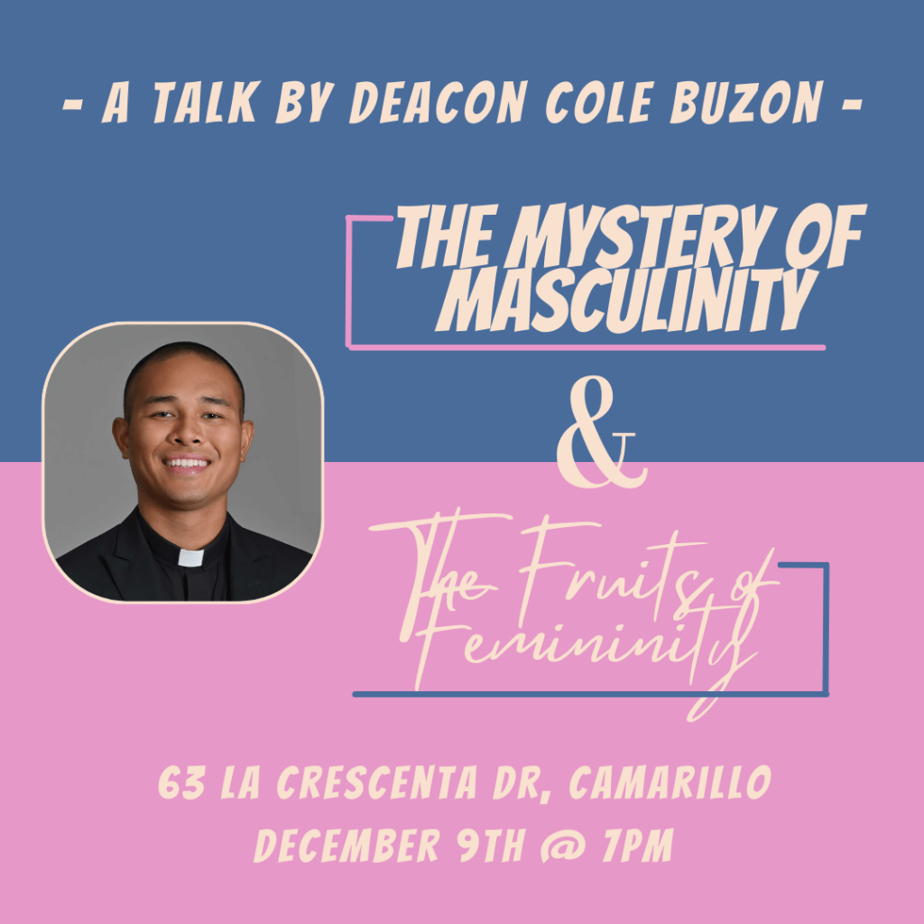 Join us for a talk by Deacon Cole Buzon titled “The Mystery of Masculinity and the Fruits of Femininity” on December 9th at 7pm! Please bring a snack or beverage to share. Get ready to sit back, gleam wisdom, and meet someone new!