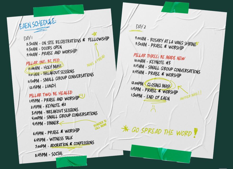 Ever Ancient Ever New (EAEN) is a Eucharistic Conference for young adults across the four Southern California Dioceses. It is in response to the Bishops’ call for Eucharistic Revival. Through a series of workshops, sessions, and Sacramental encounters, we will wrestle with the words of Jesus, “This Is My Body.”