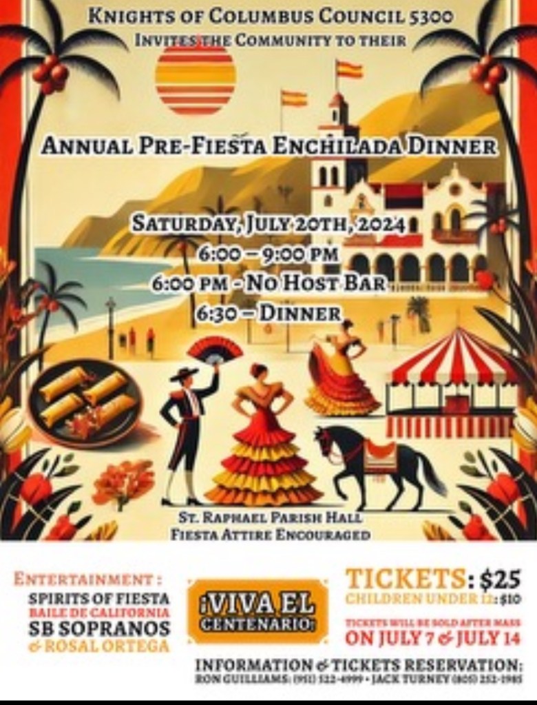 The Knights of Columbus are hosting a Pre-Fiesta Enchilada Dinner this Saturday (July 20th) at Saint Raphael’s parish hall! The event is hosted by the Knights of Columbus. Tickets are $25 and include a drink. Fiesta attire encouraged!