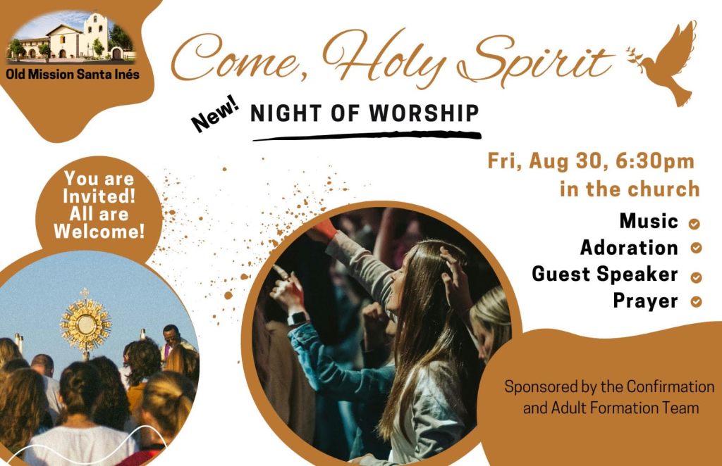 Join Mission Santa Ines for a Night of Worship on August 30th! The evening will begin at 6:30pm and include music, adoration, guest speaker and prayer. ALL AGES WELCOME!