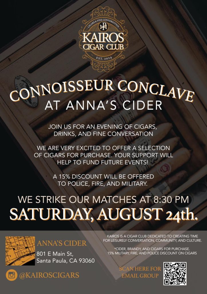 Join Kairos for cigars, drinks and conversation on August 24th at Anna’s Cider! Cigars will be for purchase to help support future events.