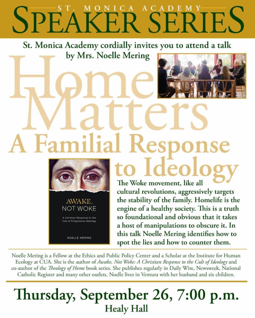 Noelle Mering is a Ventura local, author and speaker who will be giving a talk at St. Monica Academy on September 26th! The talk is titled “Home Matters – A Familial Response to Ideology”.