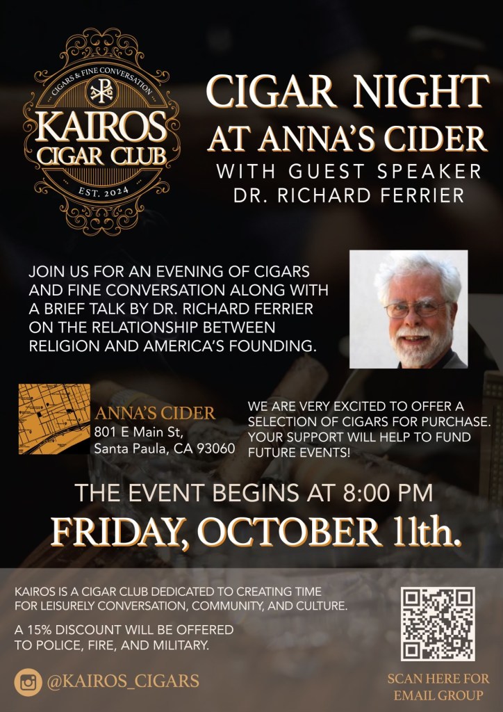Join Kairos for their monthly Cigar Night! Featuring Dr. Richard Ferrier on “The Relationship Between Religion and America’s Founding”.