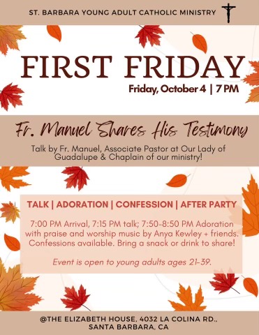 Join the Saint Barbara YAM for their First Friday event on October 4th! Fr. Manuel, pastor at Our Lady of Guadalupe, will share his testimony. The event starts at 7pm with talk, adoration, worship and after-party!
