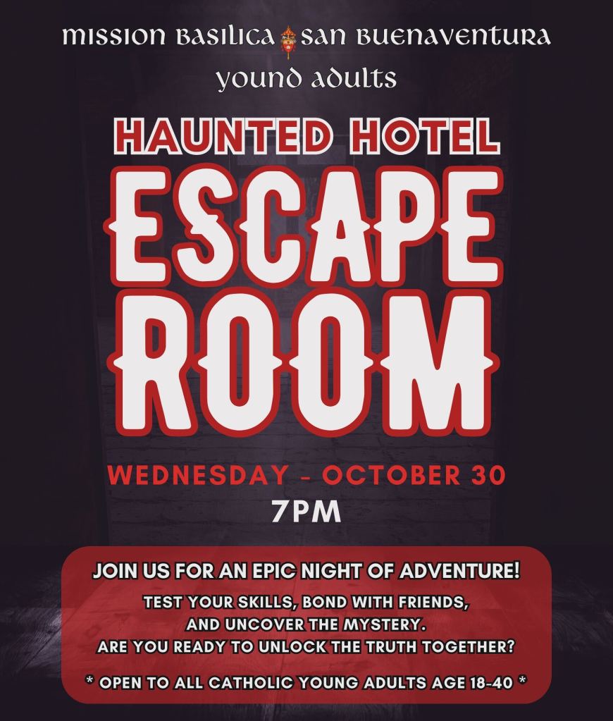 Test your skills at the Mission Bascilica’s Escape Room in its historic (and haunted?) hotel! Open to all Catholic young adults ages 18-40!