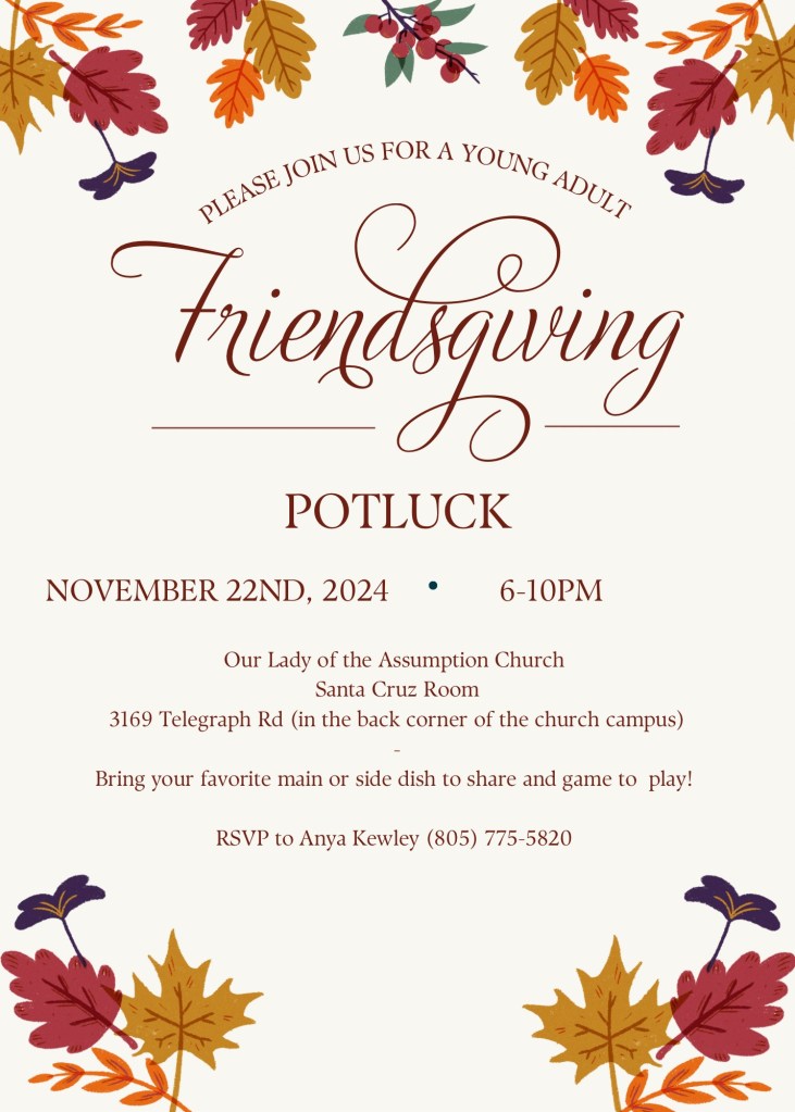 Our Lady of the Assumption will be hosting a Friendsgiving on November 22nd! The event will be in the Santa Cruz Room. RSVP with Anya!