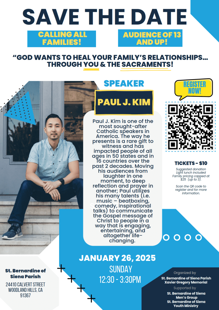 Calling all families to join St. Bernadine of Siena Parish for the renowned and dynamic speaker, Paul J. Kim! Mr. Kim will be speaking about family relationships and the sacraments. The presentation takes place Sunday, January 26th from 12:30-3:30 PM in the Parish Hall. A light lunch, followed by the presentation and then Q&A session is scheduled.