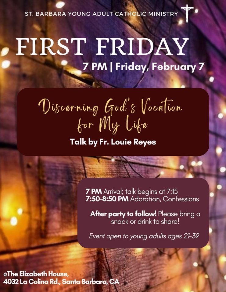 Join St. Barbara YAM for their First Friday event! This month’s speaker is Fr. Louie Reyes on “Discerning God’s Vocation for My Life”.
