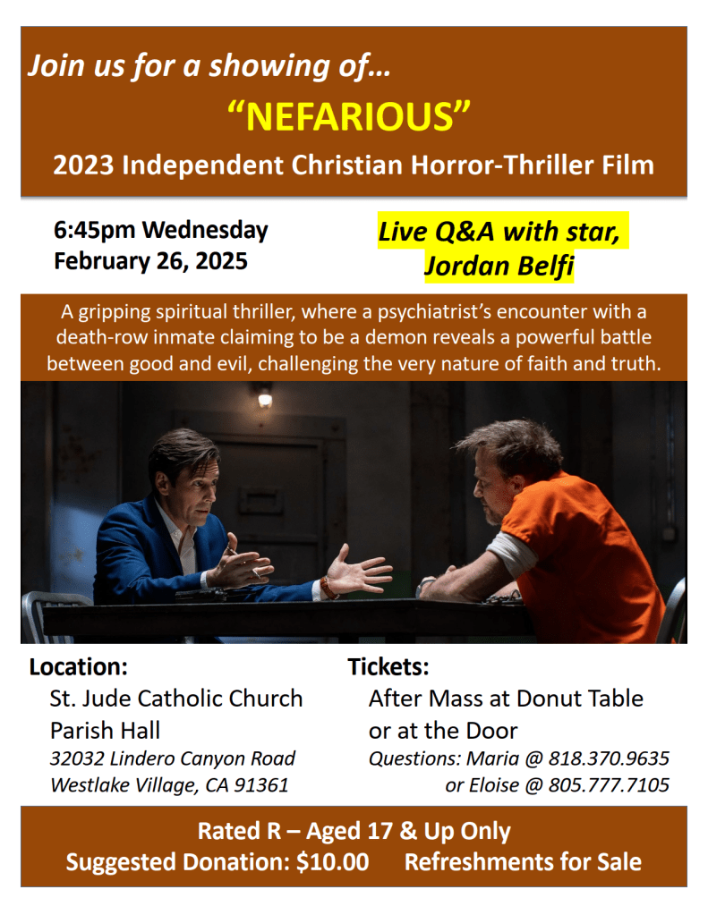 St. Jude Catholic Church is hosting a showing of “Nefarious” on February 26th! An excellent film, but don’t take my word for it – watch the trailer!