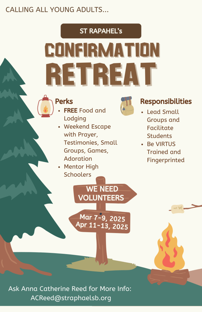 St. Raphael’s needs your help with their confirmation retreat on April 11-13th! If you’re looking for a way to give back to the community this week, please reach out to Anna Catherine at acreed@straphaelsb.org.