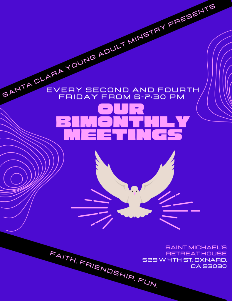 Join the Santa Clara Young Adult Ministry for their bimonthly meetings every second and fourth Friday of the Month! They meet at the St. Michael’s Retreat House from 6-7:30pm.