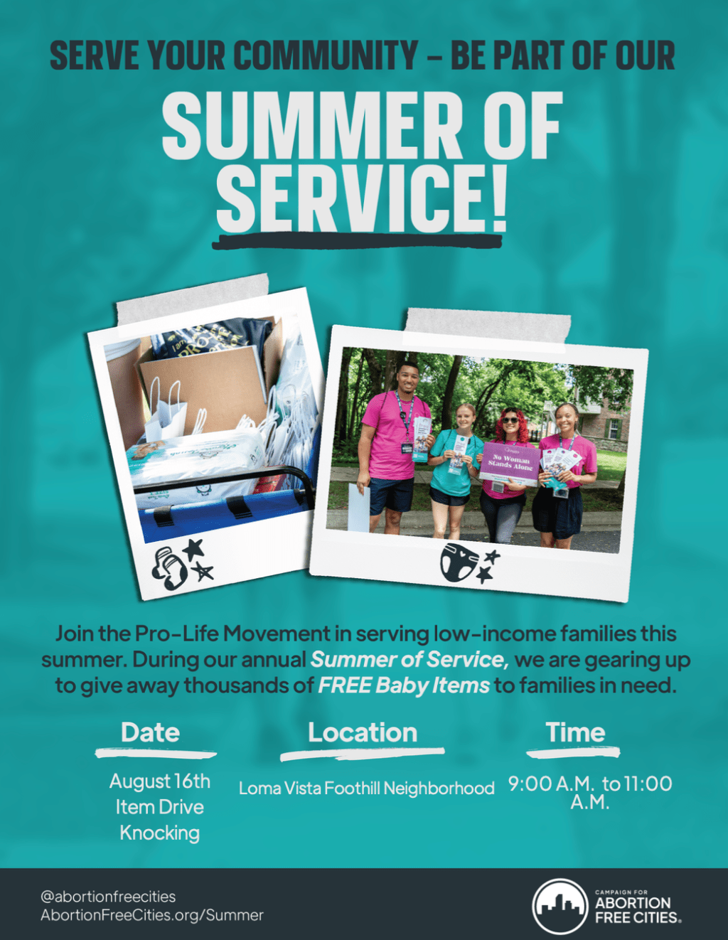 Abortion Free Cities (AFC) will be door-knocking in the Loma Vista Foothill Neighborhood (behind Ventura College) on Sat Aug, 16 to invite neighbors to donate baby items for the Life Centers of Ventura County, supporting pregnant women in tough situations.