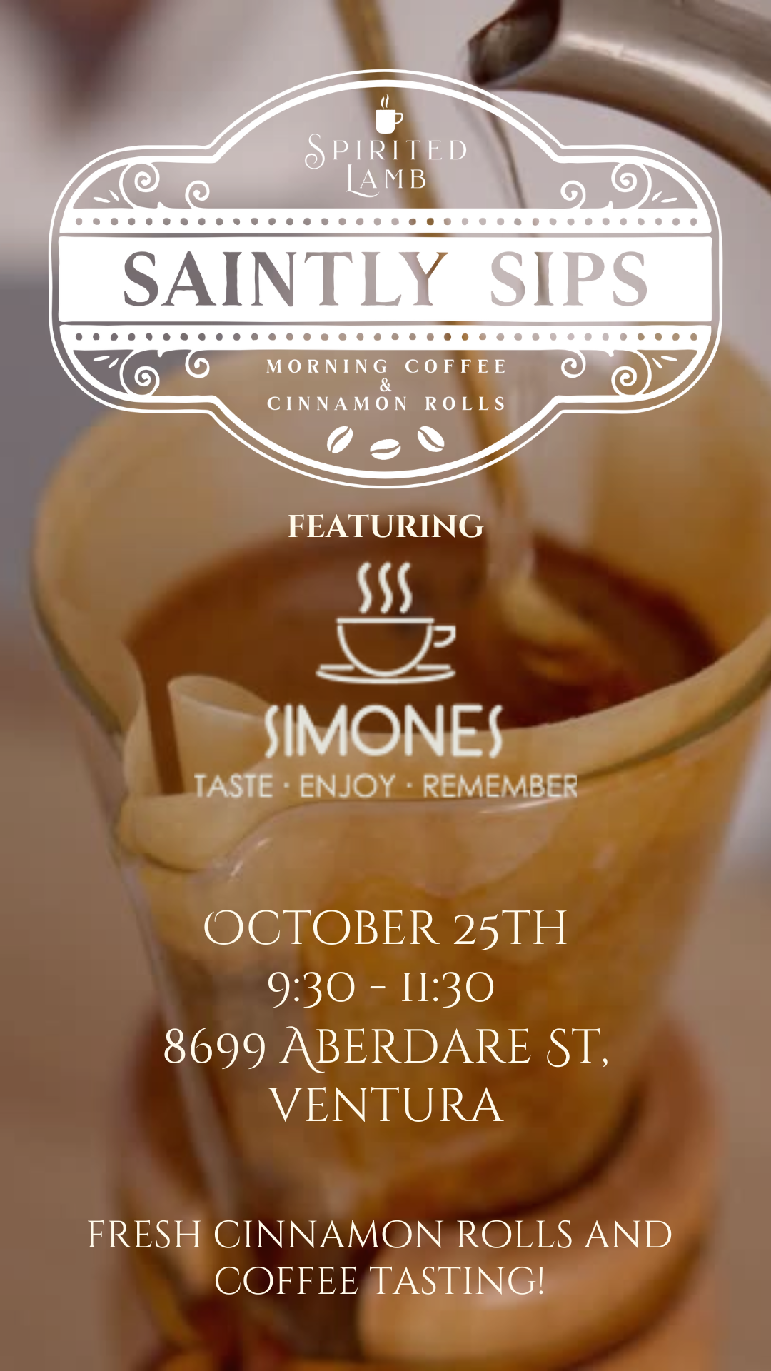 Join Spirited Lamb for our Saintly Sips event every third Saturday of the month! Featuring Simones Coffee and fresh baked cinnamon rolls! All ages welcome!