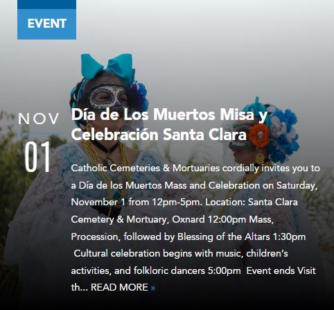 Catholic Cemeteries & Mortuaries cordially invites you to a Día de los Muertos Mass and Celebration on Saturday, November 1 from 12pm-5pm.