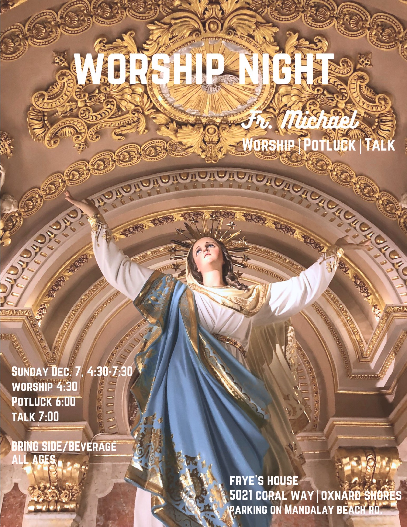 Join us for a worship night in Oxnard Shores! The afternoon will include a potluck, talk by Fr. Michael O’Laughlin, and worship. Smoked pork, chili and tacos as mains, bring a side or favorite drink if you stay for the potluck!