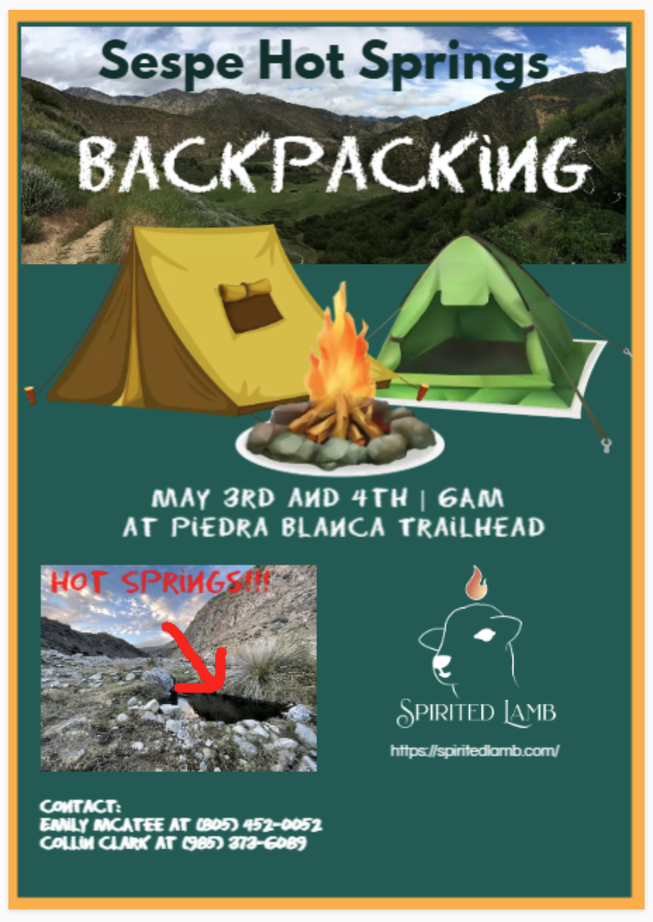Feeling up for an adventure? Join Emily and Collin for a backpacking trip to Sespe Hot Springs in May! Pull out that old backpack, lace up those dusty hiking boots, and get ready for some epic wilderness.
