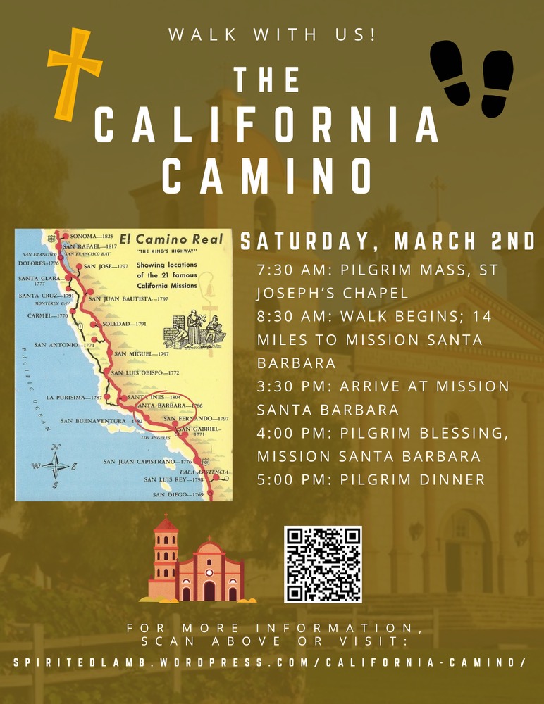 Join us for a day on the California Camino! We will be walking 18 miles from St. Joseph’s Chapel to Mission Santa Barbara on March 2nd!
